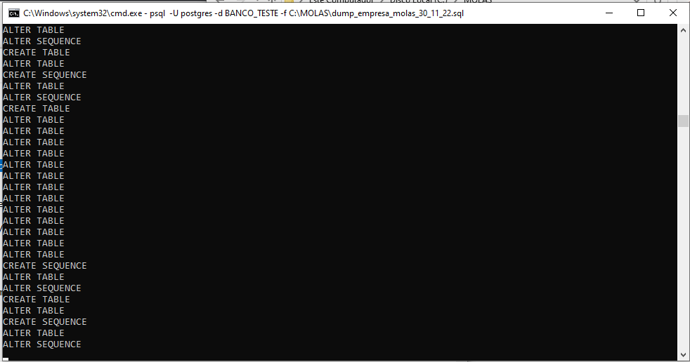 psql -U postgres -d BANCO_TESTE -f C:\MOLAS\dump_empresa_molas_30_11_22.sql (comando final) U- nome do banco no caso POSTGRES, DBNAME- nome criado no PgAdmin -f caminho do banco do cliente.