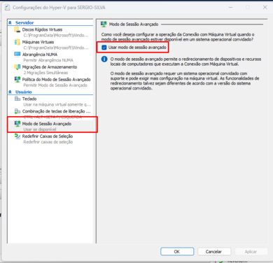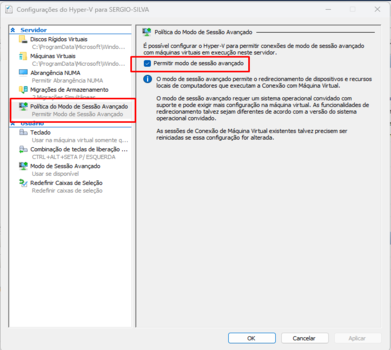 Clicar na maquina virtual para selecionar e clicar em configurações do Hyper-V.