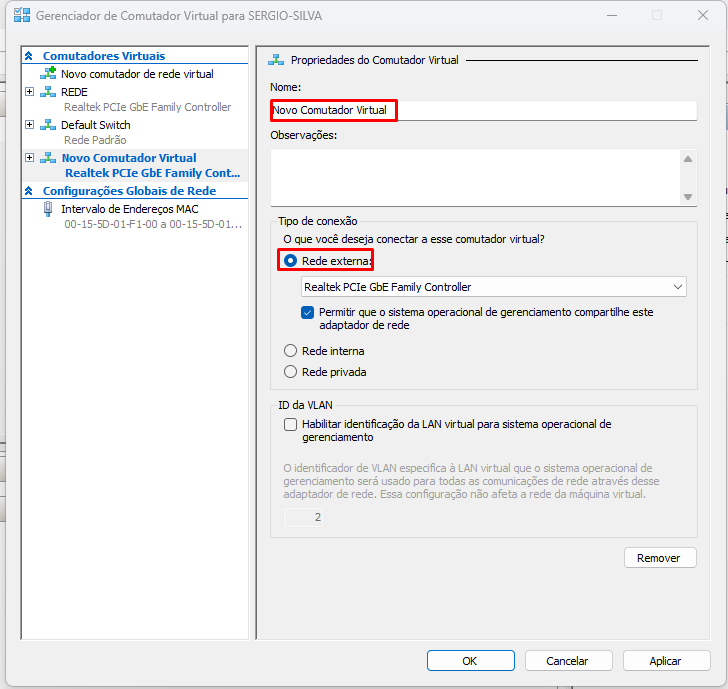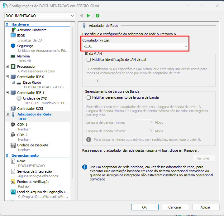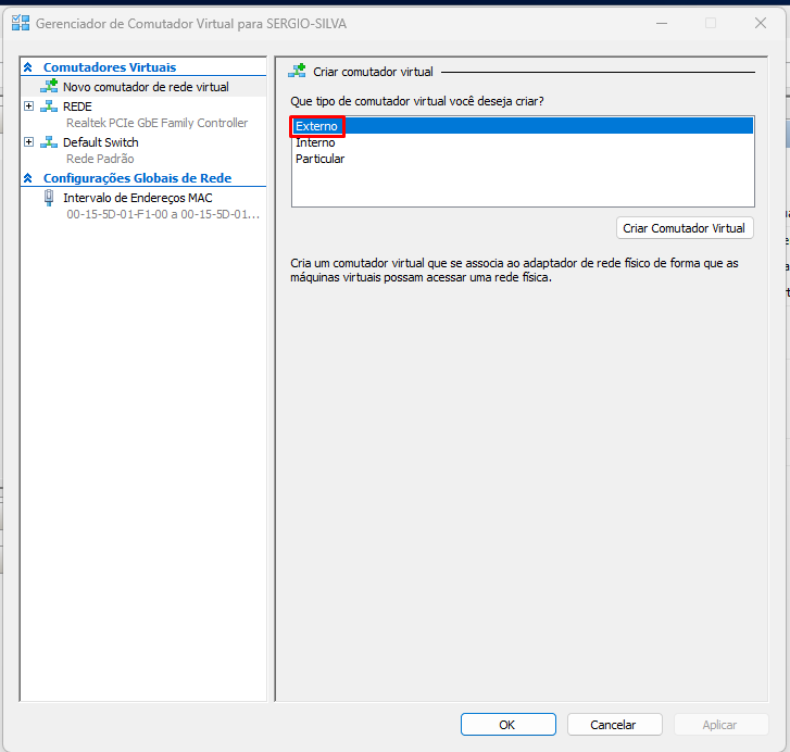 Após Clicar criar Comutador Virtual, definir um nome para driver de rede.