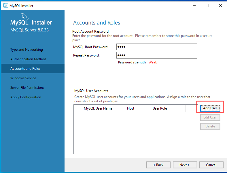 Accounts and Roles: Definir a senha na parte superior do usuario ROOT.