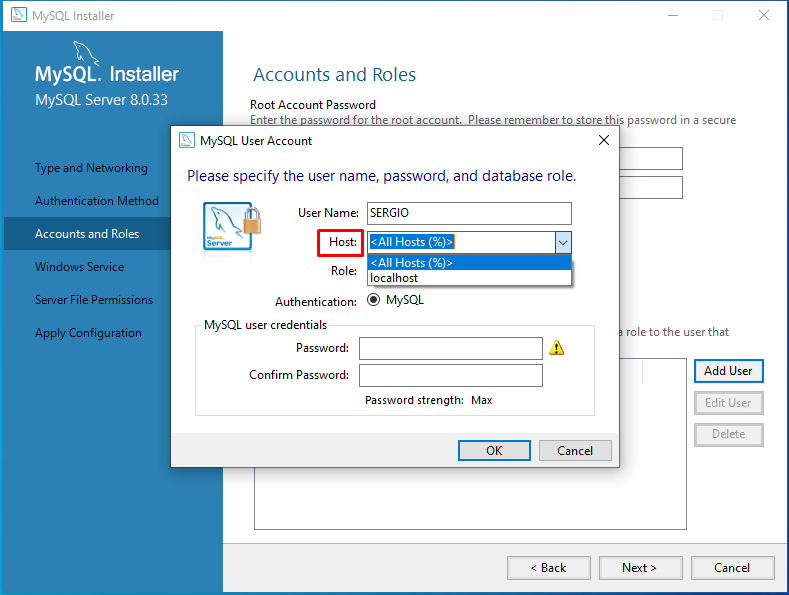 Após clicar em ADD USER, selecionar a opção ALL HOST para acessar de outra maquina. Definir senha: