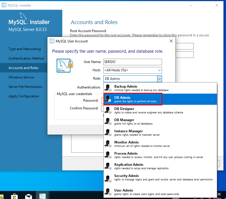 Role: Selecionar BD ADMIN para ter todas as permissões no banco de dados.