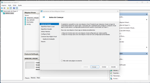 6. Avançar e adicionar um nome para a maquina virtual, após avançar, escolher a geração 1, não selecionar a 2 pois não tem compatibilidade com recursos de rede para acesso externos. Escolher a quantidade de memoria para virtualização, em rede deixar a Default Swith.