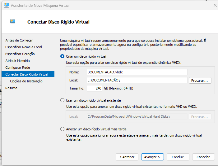 Conectar Disco Rígido Virtual: Marca opção Criar um disco Rígido virtual, selecionar o local desejado.