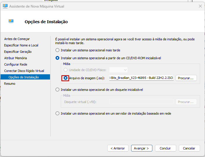 Após avançar marca a opção instalar um sistema... e procurar a ISO salva na sua maquina física.