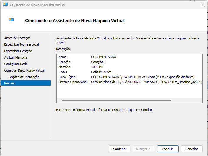 Após avançar irá mostrar o resumo das configurações.
